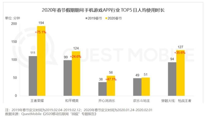 数据显示王者荣耀的用户使用时长在2020年春节期间同比增长近75%,达到194分钟。这不是孤例,DT财经的一份数据显示,疫情期间活跃用户规模增长最多的1000个App中,游戏类App就占了逾400个。