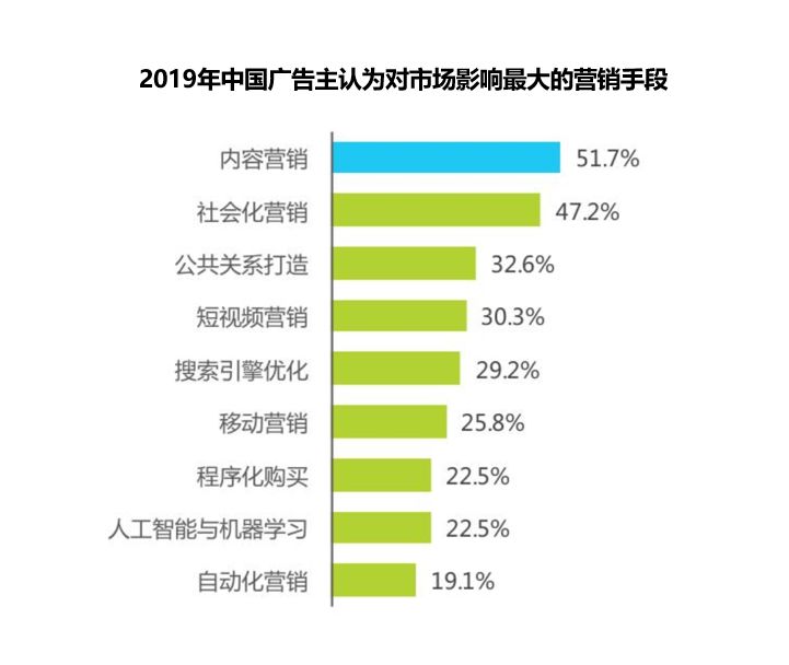 艾瑞咨询的报告就显示,2019年中国广告主最关注的营销手段是“内容营销”,51.7%的受访者选择了这一项,它的受重视程度甚至超过社会化营销(47.2%)与公共关系打造(32.6%)。