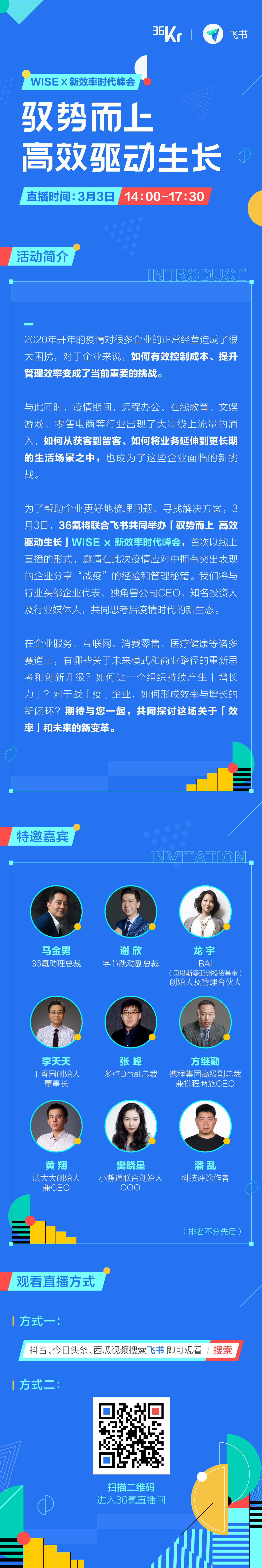 为了帮助企业更好地梳理挑战、探讨高效增长的长期解决方案,3月3日,36氪将联合飞书共同举办“驭势而上 高效驱动生长”WISE x 新效率时代峰会,邀请字节跳动副总裁&飞书负责人谢欣、36氪合伙人兼助理总裁马金男、 BAI(贝塔斯曼亚洲投资基金)创始人及管理合伙人龙宇、丁香园创始人董事长李天天、多点Dmall总裁张峰、携程集团高级副总裁兼携程商旅CEO方继勤、法大大创始人兼CEO黄翔 、小鹅通联合创始人COO樊晓星、 科技评论作者潘乱等行业大咖,首次以大型线上直播的形式,从不同角度分享行业趋势和管理秘籍,共同探讨行业高效转型、企业高效成长的可行路径。
