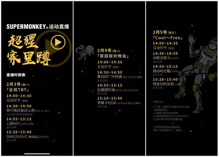 在隔离初期,很多企业还没反应过来时,超级猩猩就开启了教练直播计划。在Yi直播平台上一经播出,最高在线人次达7万人次。