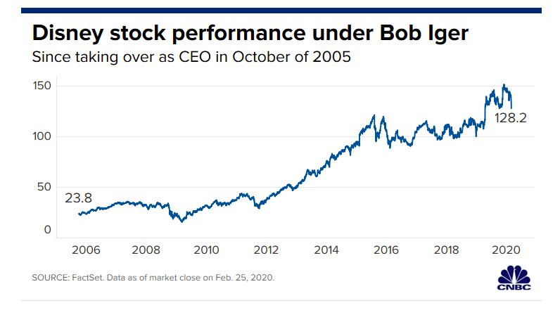 一组数据或许可以更明了地表明伊戈尔对迪士尼的巨大贡献。CNBC的统计数据显示, 伊戈尔任职期间,迪士尼的股票总体处于持续上升阶段,从2006年的每股23.8美元一直高涨到2020年的128.2美元,总市值则达到2314亿美元。美联社和高管数据公司Equilar的计算显示,伊戈尔本人在2018年成为全球薪酬最高的第二大CEO,收入高达6560万美金。