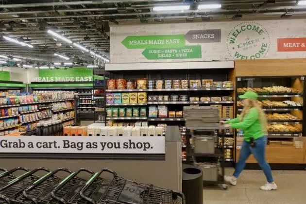 通过扫描智能手机QR码的自助服务亭进入超市后,熟悉的景象向传统的杂货店购物者打招呼:一排准备就绪的购物车,以及免费的环保购物袋。
