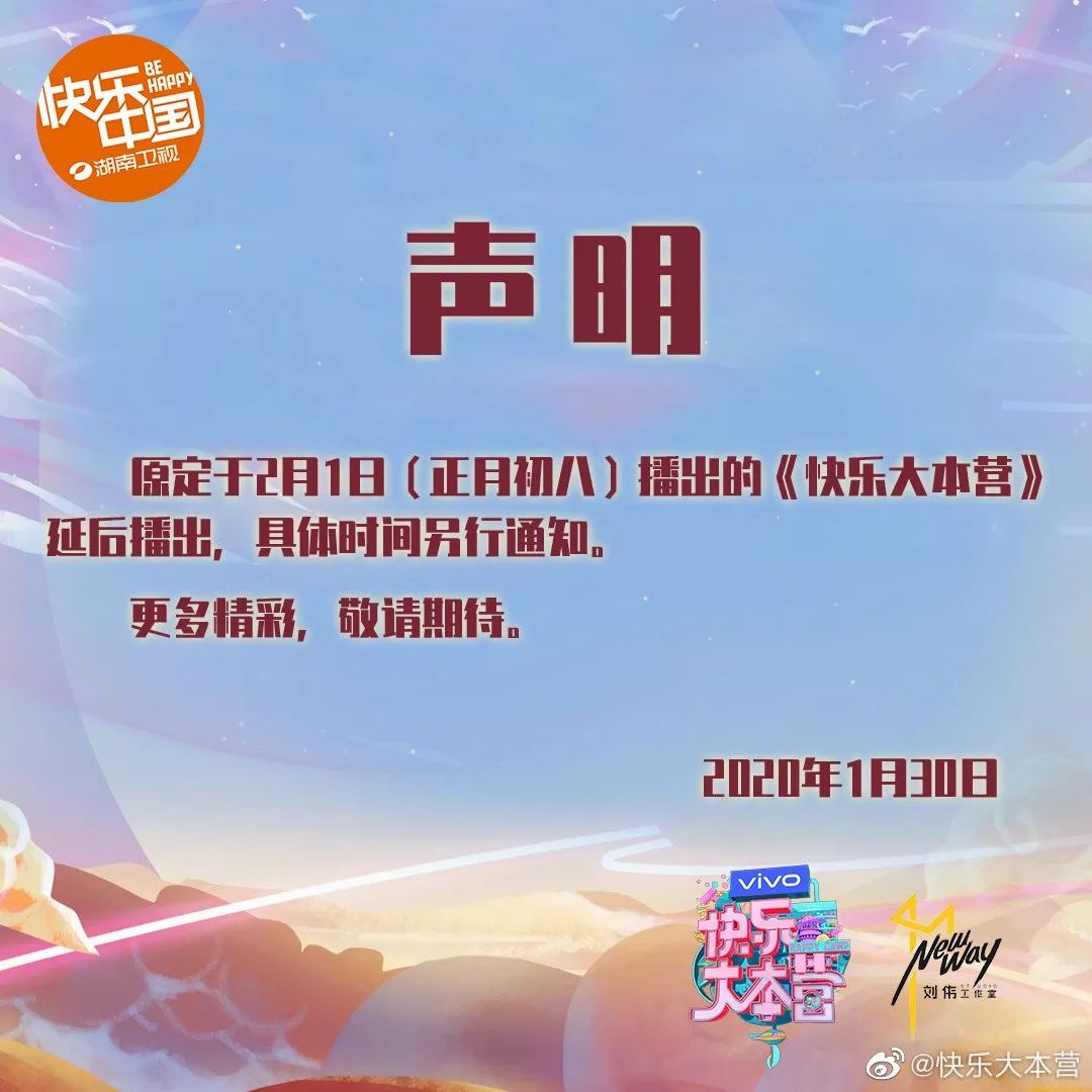 一方面,在广电总局提高疫情防控宣传的号召下,不少电视节目暂停播出。1月30日,湖南卫视宣布《快乐大本营》延播,改播金鹰剧场《下一站是幸福》,同时推出特别报道《众志成城抗大疫》。