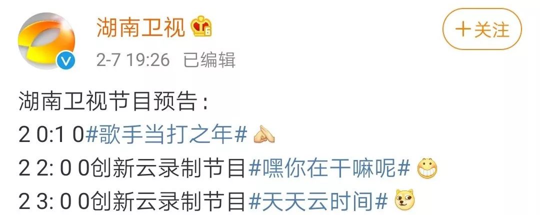 2月7日,和《歌手·当打之年》一起播出的,还有湖南卫视首推的另外两档综艺,由快乐大本营团队打造的《嘿,你在干嘛呢》,和由《天天向上》团队打造的《天天云时间》。