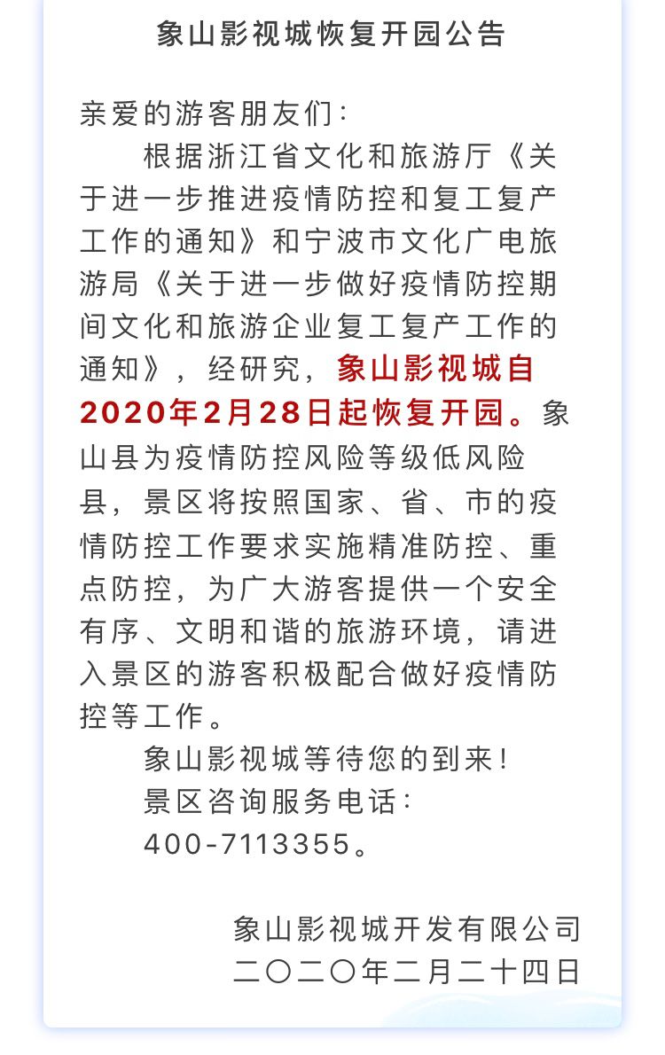 我们了解到,象山影视城面对疫情,在之前就推出了《应对疫情支持影视企业共渡难关八项措施》之后,决定于28日正式恢复开园。