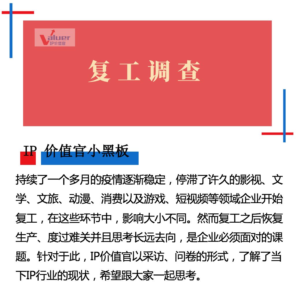 据IP价值官问卷调查,对于影视、文学、文旅、消费以及动漫、短视频等泛文娱领域,目前91.6%的企业已复工,其中70%仍是在家办公。