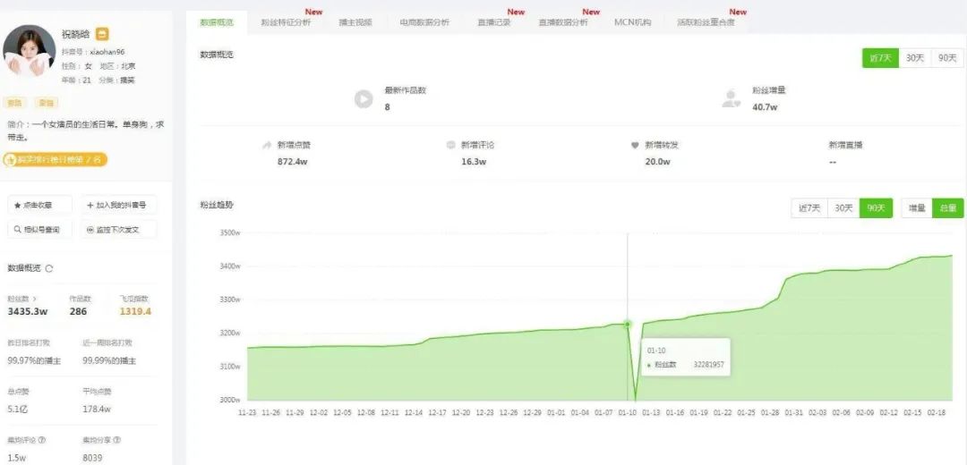 爆发阶段 —— 在某个爆款视频的带动下,粉丝数量开始爆发式增长,视频的播放量和点赞量都会增长到一个新的高度。