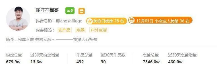 我记得当时很多人猜测,石榴哥这种火的方式,没有自己的内容,无法持续,很快就会凉。但是现在石榴哥自己的抖音账号还有600多万粉丝,最近30天还新增了460万点赞。近期的单个视频平均点赞量在3万左右,偶尔有一两个小爆款。这些数据说明,丽江石榴哥的抖音账号,目前正是处于平稳阶段。