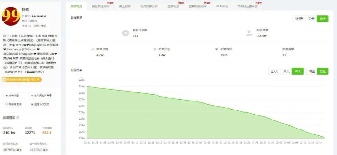 而且根据飞瓜数据显示,陆超抖音粉丝连续90天负增长,这种情况还是相当罕见的。