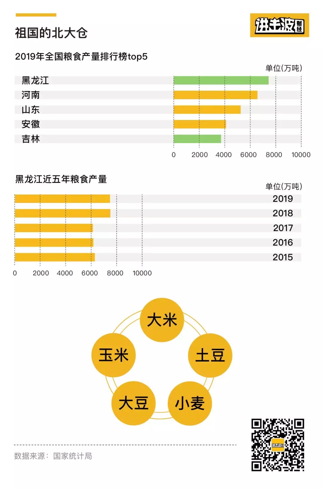 在国家统计局发布的《关于2019年粮食产量数据的公告》中,2019年全国各省粮食产量前五位中,东北地区占据两席,分别是排名第一的黑龙江(7503万吨),以及排名第五的吉林(3878万吨),他们也是全国仅有的5大粮食调出省之一。
