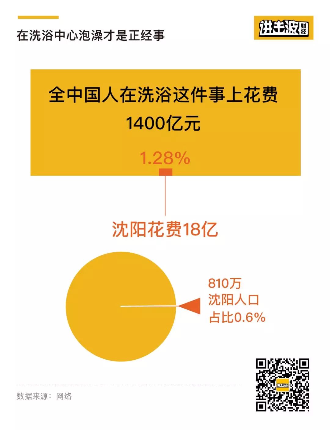 2018年,全中国人在洗浴这件事上花费了1400亿元。以辽宁沈阳为例,2018年沈阳人花了18亿洗澡,洗浴消费占全国总消费的1.28%,而沈阳的人口为810万,相较于全国总人口占比仅为0.6%左右。