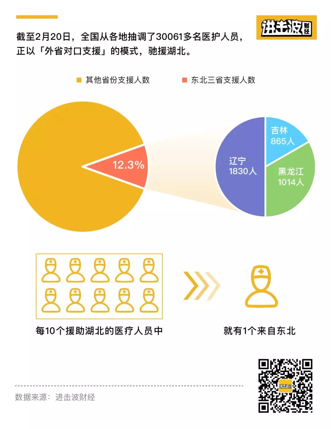 其中,东北三省共派出3709名医护人员,包括辽宁1830人,吉林865人,黑龙江1014人,加起来约占总支援人数的12.3%。也就是说,每10个援助湖北的医疗人员中,就有1个来自东北。