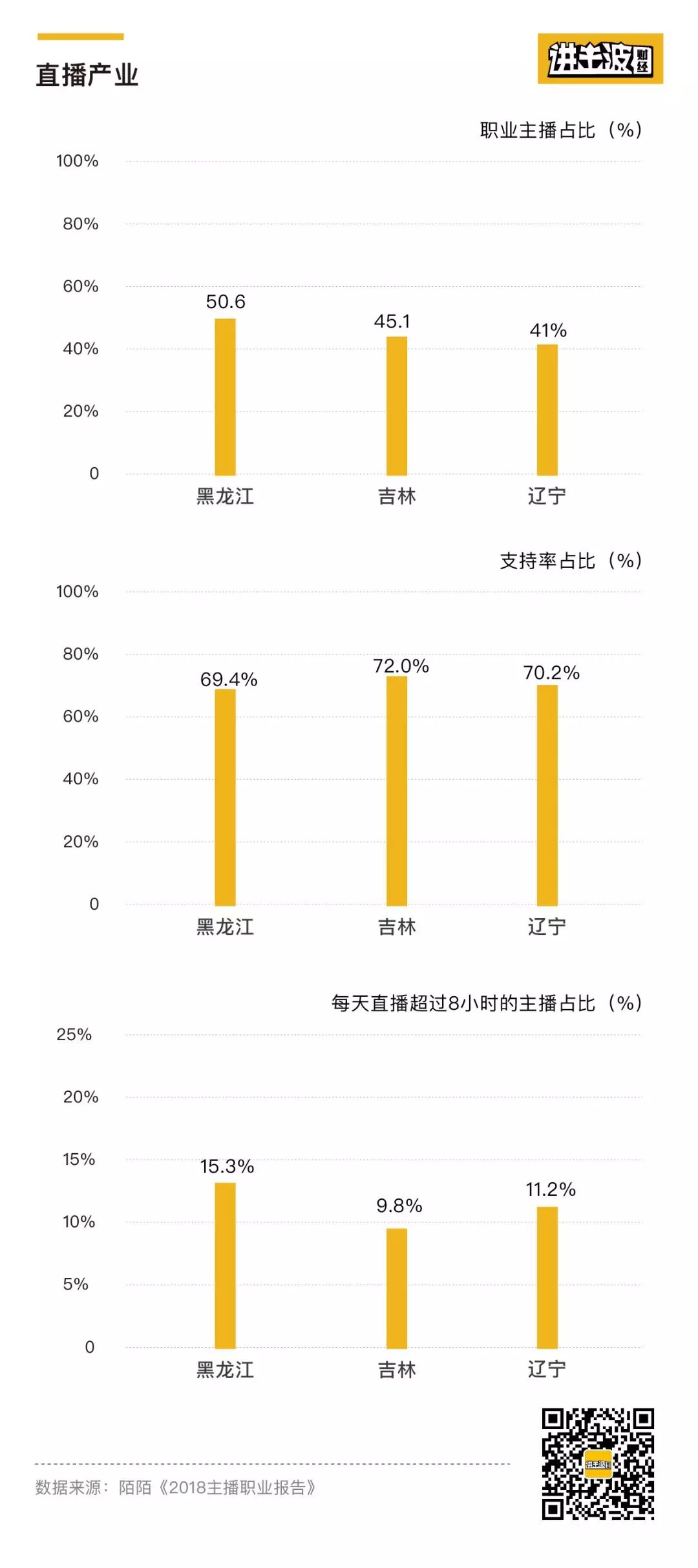 根据陌陌《2018主播职业报告》,黑龙江、吉林、辽宁三省的职业主播占比最高,分别为50.6%、45.1%、41%,牢牢占据前三甲的位置。