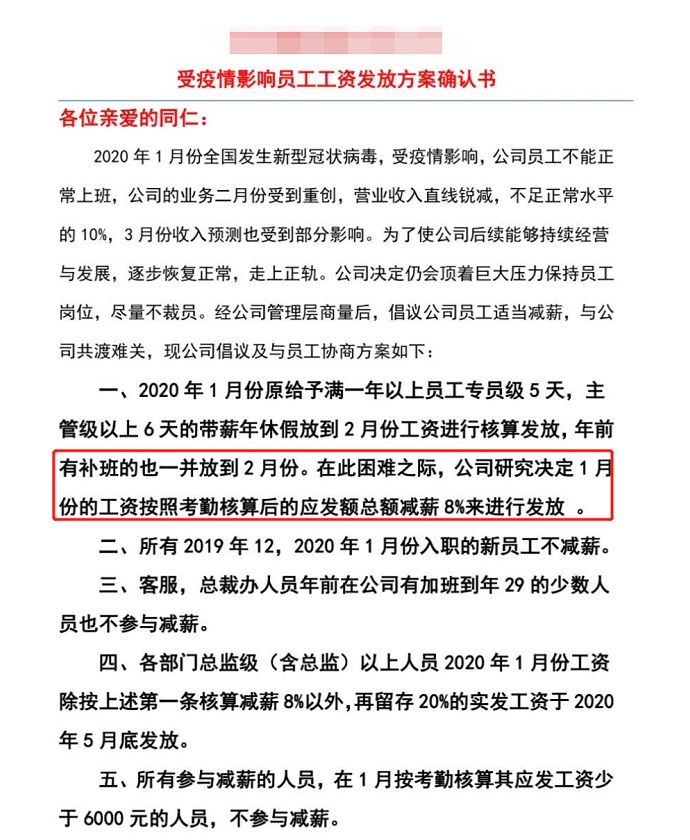 王越林告诉锌刻度,在这份倡议书中,公司为员工提出了两个选项,一是从2月份开始,工资按在线办公“自愿”降薪50%来算,直到公司的情况有所好转,才恢复正常工资;二是2月份工资发放70%,3月份开始在家停薪留职,同样是等到公司运营恢复正常后再参与工作。