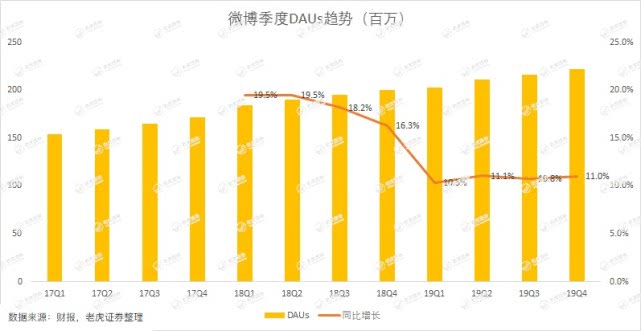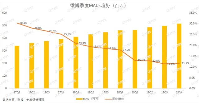 四季度微博月活跃用户数(MAUs)5.16亿,同比增11.7%;日活用户数(DAUs)2.22亿,同比增11.0%。MAU和DAU增长下行趋势不改,好在相对上季度均有提升。