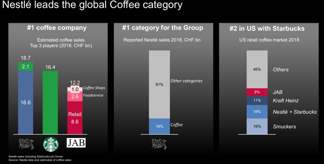 雀巢发布的2018年全球咖啡市场份额前三位(销售额)