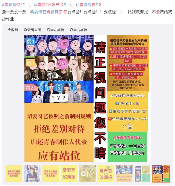 然而,话题里的内容除了官方账号对发布了的宣传微博,基本都是蔡徐坤的粉丝要求节目组修改海报的诉求。点开@爱奇艺青春有你 的账号,自2月24日发布“助力到达”海报起,之后已发布的10余条微博中,热评也都被蔡徐坤的粉丝们占领。