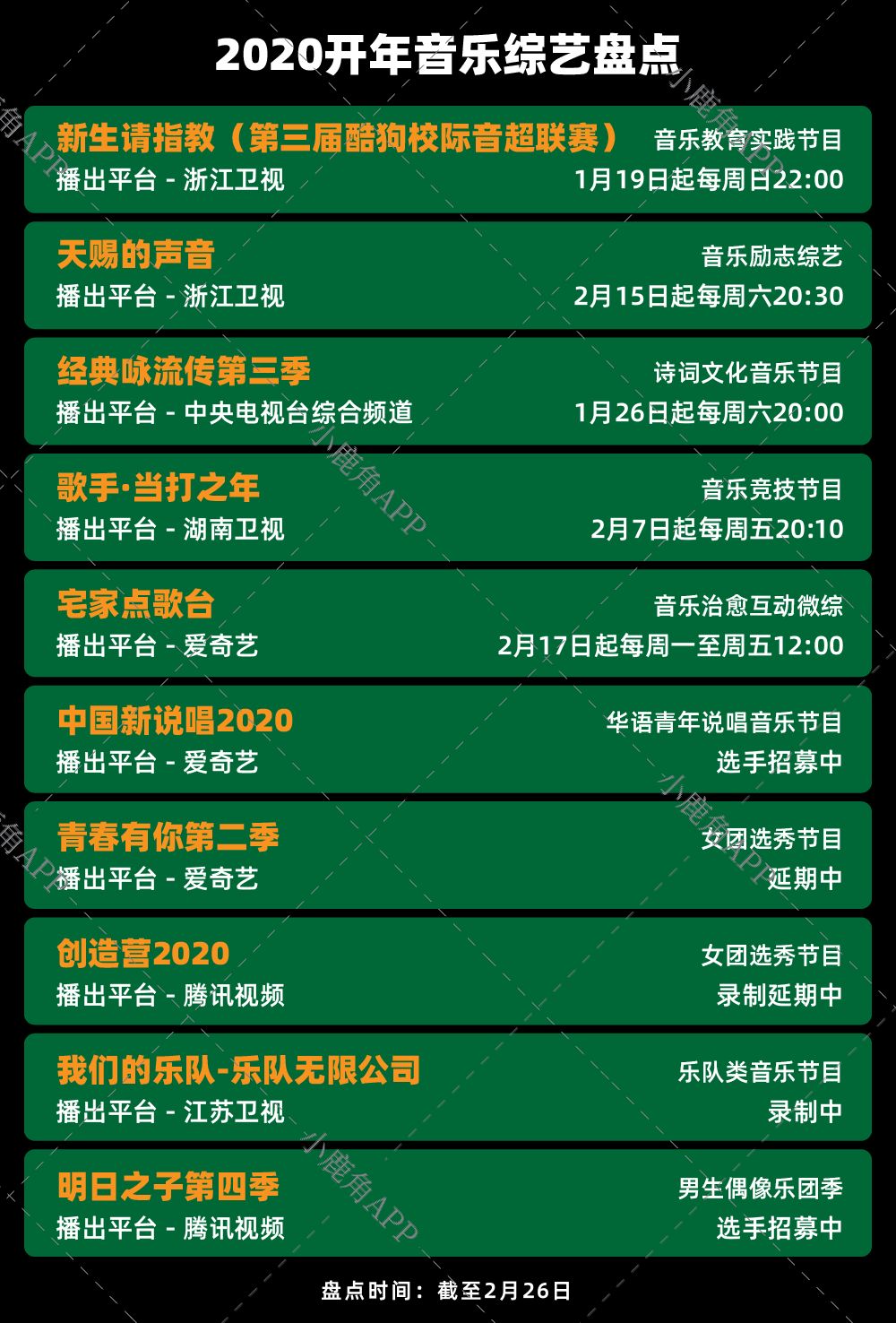 的确,目前一切活动还是要为防控疫情让路。据小鹿角音乐财经统计,2020年开年音乐综艺中,除了年前已经开播的节目,均暂停了录制或定档。