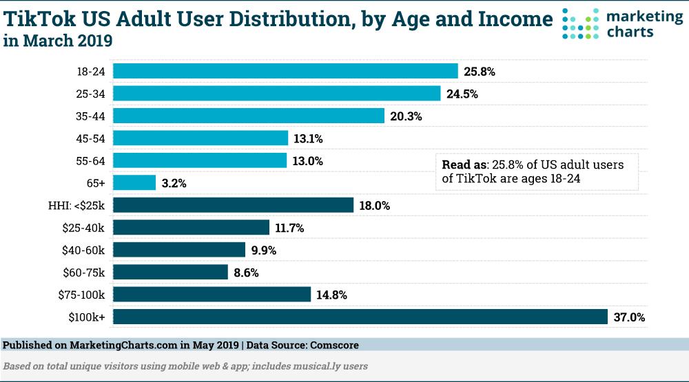 marketing charts曾在2019年5月做过一次统计,美国用户中占比最多的用户群体,其家庭年收入大于等于10万美元。但这并不代表着有钱人才是美国TikTok的大户,这部分归结于这个群体在美国本身所占的比例。