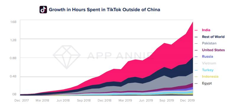 据The Economic Times报道,印度用户平均每天要花费38分钟在TikTok,在Instagram和Facebook上分别为44分钟和35分钟。来自App Annie的数据表明,印度用户2019年在TikTok上的停留时间,比2018年整整增长了240%,其比例占抖音海外用户使用时长的48%。