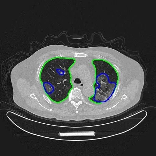 利用AI技术对CT图像进行自动分割,“腾讯觅影”AI专用CT设备最快2秒即可完成新冠肺炎识别,相关设备已在湖北进行部署。上图中,绿色圈是肺部,蓝色圈是新冠肺炎病灶。