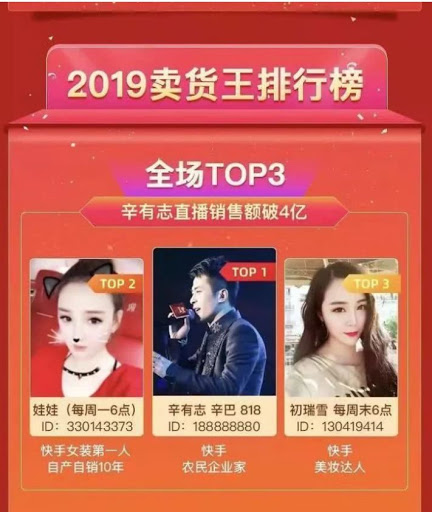 2018年11月6日,快手第一届卖货王争霸赛,娃娃店铺营业额4300万,在女装品类排名第一,散打哥销售额达到了1.6亿,是当年的卖货王。到了2019年,“我太难了”成为年度流行梗,熊猫直播关停,全国各地却在涌现“快手村”,辛巴一天销售额达到4亿,在他的婚礼上,成龙、王力宏等42位明星到场,一时风头无俩。