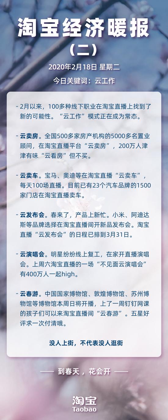 阿里从2月17日开始发布的《淘宝经济暖报》数据显示,2月份以来,100多种线下职业,都已经开始在淘宝直播,每天有超过3万人开新店。500多家房产机构直播卖房,23个汽车品牌直播卖车,小米、阿迪达斯等品牌直播开发布会,明星们直播开演唱会,各大博物馆直播春游活动......