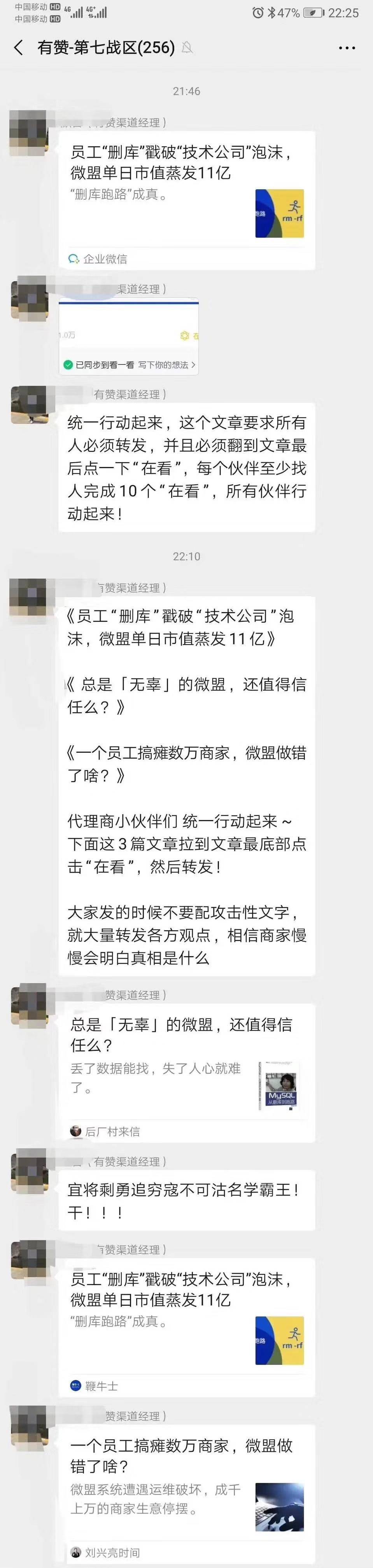 27日,一张群名称为“有赞-第七战区”的微信群截图开始流传。群里有多篇对微盟极为负面的媒体文章,一位备注“有赞渠道经理”的人说:“每个伙伴至少找人完成10个‘在看’,所有伙伴行动起来!”截图真实性有待考证。