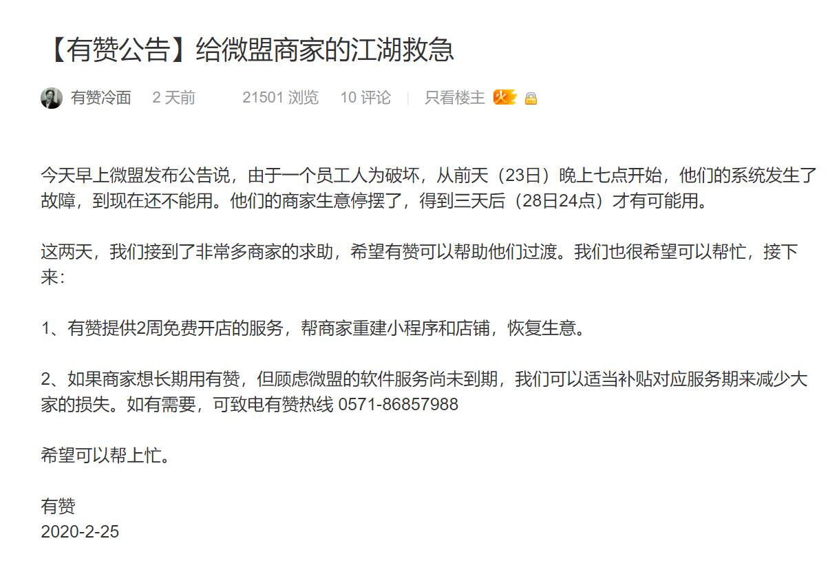 在25日,有赞创始人白鸦就在微信朋友圈表示:“有赞的商家论坛也来了很多微盟的商家咨询有赞可不可以帮他恢复生意,这些都让人挺担忧的。”