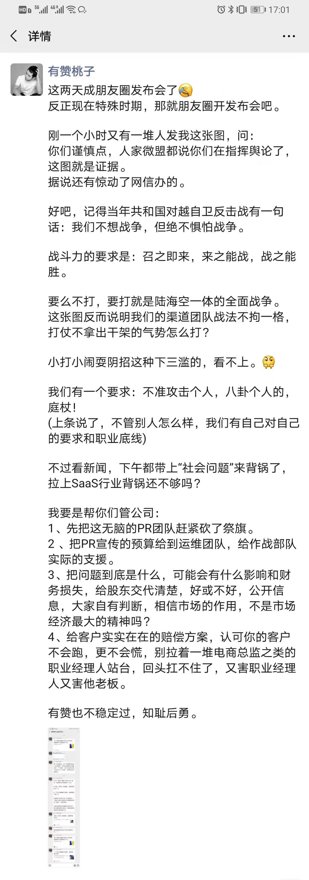 2月27日晚上,有赞CFO桃子又疑似在朋友圈承认了公关战:“记得当年共和国对越自卫反击战有一句话:我们不想战争,但绝不惧怕战争。”“这张图反而说明我们的渠道团队战法不拘一格,打仗不拿出干架的气势怎么打?”