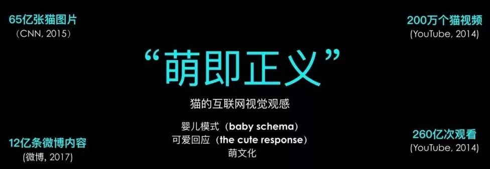 Youtube 2014年的数据显示有200多万个关于猫的视频,有260亿人次关于猫的观看。这个数字今天肯定是乘以几何倍数的,微博上面在2017年有21亿条关于猫的微博内容。所以从数据上来看 ,确实已经成为一个风尚、主流,成为我们今天的大众主流文化。