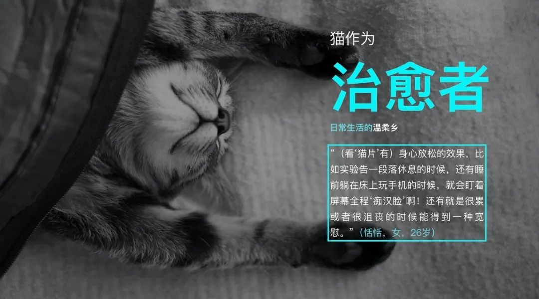 我们看一个访谈:她说“看猫片的时候身心非常放松,比如我做实验告一段落休息的时候,睡前玩手机的时候就会盯着屏幕,全程痴汉脸,还有就是很累或者很沮丧的时候,得到一种宽慰。”