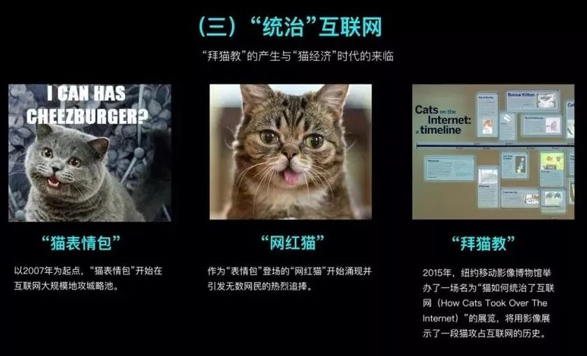 在美国甚至产生了一个教派,叫拜猫教。2015年纽约移动影像博物馆举行了一场“猫如何统治互联网”的展览,用影视的方式展示了猫占领互联网的历史。这是一个关于猫统治互联网的时间线性了解。
