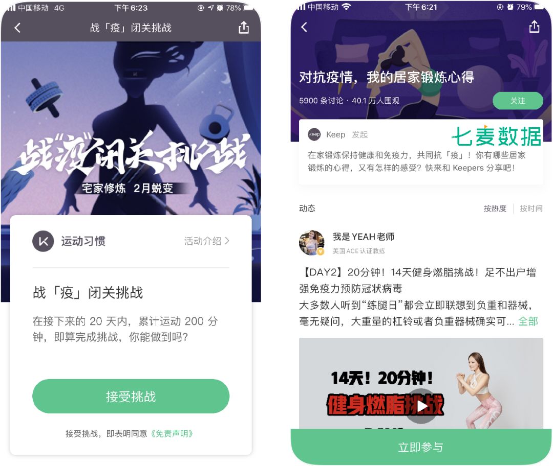 用户宅家时间过长,也激发了线上健身活动的需求。拥有线下店和线上平台的「Keep」,开始有针对性的发起相关活动、话题和课程,引导用户参加。线下用户转化到线上,满足用户健身需求的同时,也让「Keep」进一步加强在社交领域的布局。
