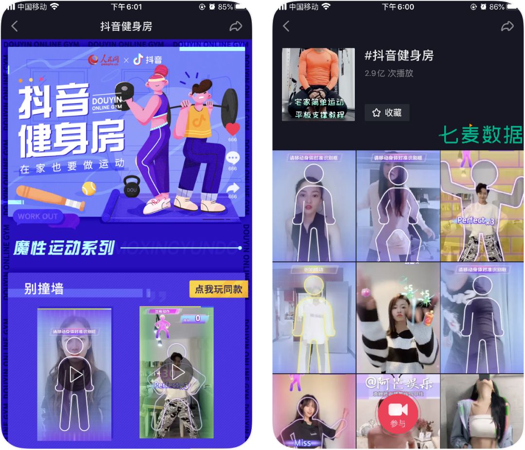 同时,「抖音」也开启为期两周的“线上健身房”活动,邀请汪东城、蒋梦婕、陈一冰等健身达人和明星,号召用户在家做运动。与其他开展“线上健身房”平台不同的是,「抖音」专门为健身推出了相关的小游戏“别撞墙”、“杀毒达人”。如用户需在规定时间内,完成“墙上”的深蹲、耸肩、拉伸等动作,否则将会撞到前方的“墙”。这既发挥了抖音超休闲小游戏的特性,也让健身增加趣味性,一时之间吸引了大量用户的参与。“抖音健身房”相关话题视频,得到 2.9 亿次播放,其中不少视频都与健身小游戏相关。