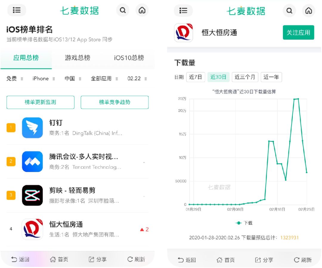 2 月 16 日,恒大发布全国各楼盘特大优惠通知,表示在 2 月 18 日至 2 月 29 日期间,恒大全国各在售楼盘(含公寓及写字楼),可享受 7.5 折优惠。用户可在其线上产品「恒大恒房通」中,实景查看楼盘信息,了解户型、居住条件、周边设备等,一时之间引发网友热议。「恒大恒房通」近期 App Store 榜单排名也因此直线上升,冲进应用免费榜 Top4,iOS 单日预估最高下载量也达到了 23w。