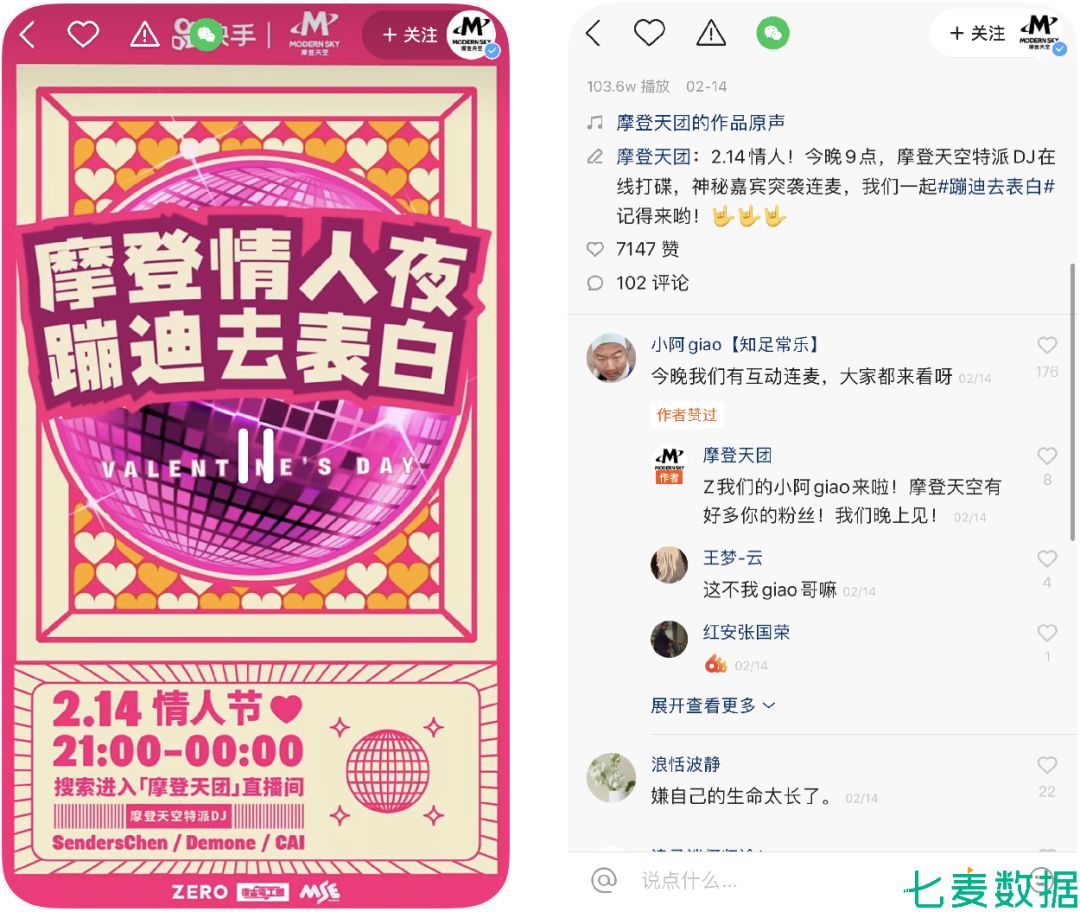1 月底,「B站」联合对角巷等乐队率先推出“线上音乐节”活动,音乐与互联网的结合方式,给了其他以年轻用户为主的短视频、直播平台新的发展方向。「抖音」、「快手」开联合线下夜店推出“云蹦迪”活动,用户在家即可感受酒吧躁动的电音和迷幻的灯光。同时,还邀请明星、歌手、乐队入驻加盟,让他们与用户直播唱歌、互动,借助粉丝经济拉动日活。活动效果十分显著,摩登天团在入驻「快手」后,在情人节发布的蹦迪活动视频,便获得 103.6w 播放量。