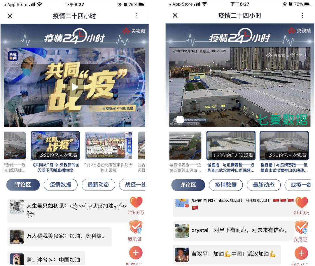 「央视频」为疫情专门展开的 24 小时慢直播,成功拓展了直播行业的新途径。此次的“疫情 24 小时”直播包括直播火神山、雷神山两所医院的建造,一线医院工作情况等等,全都是国人最为关注的事件。因此十天左右便获得了累计 1 亿人的观看。
