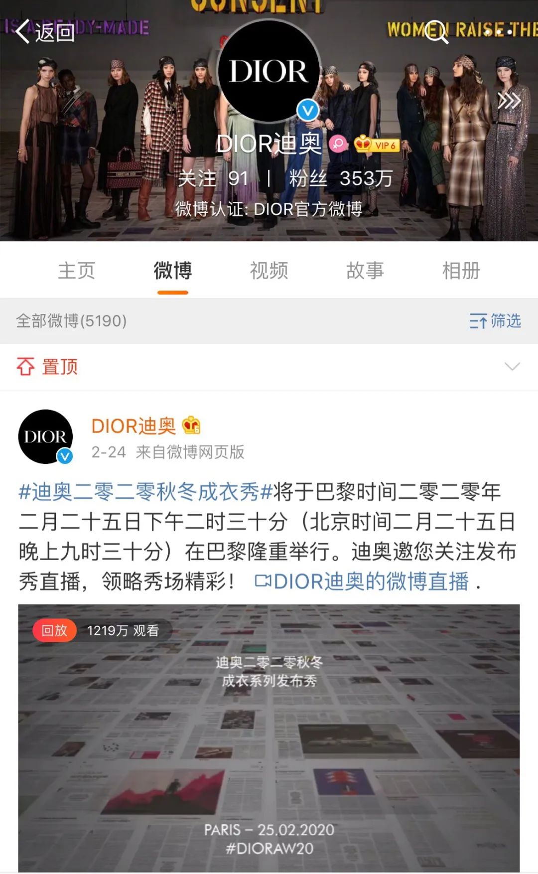 两天前,Dior在2020秋冬成衣发布秀采用了微博线上话题页“云直播”互动方式。直播开场前,Dior首先播放了Dior女装创意总监Maria Grazia Chiuri为中国观众拍摄的慰问短片,获得极大的关注,随后则是为工坊匠人和工作人员拍摄的幕后短片,他们在发布秀准备时发表了对该系列女性主义主题的看法。