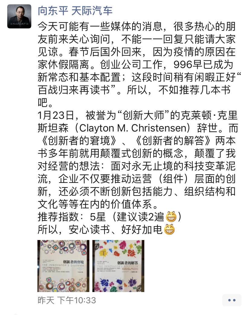 36氪Auto获悉,向东平目前微信昵称和头像仍有天际汽车后缀和标识。27日晚间,向东平在朋友圈发布消息称,“春节后国外回来,因为疫情的原因在家休假隔离”。