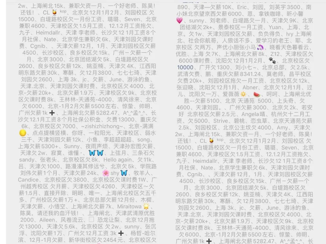 北京总部品牌部内容运营小宇在2019年12月主动离职,但欠着的9000多元薪资至今都没有发。天津刘园校区的阳阳也告诉燃财经,“1月份我们的工资就没发,1月20号左右有传言说总部要放弃我们校区,就有家长来退费,有一次一个家长和工作人员吵架吵得很凶,校区第二天就关门了。”