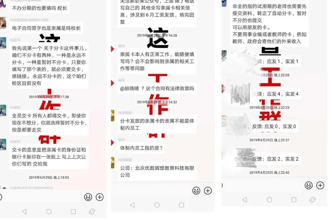 优胜教育工作群里通知员工分卡,图 / 受访者供图