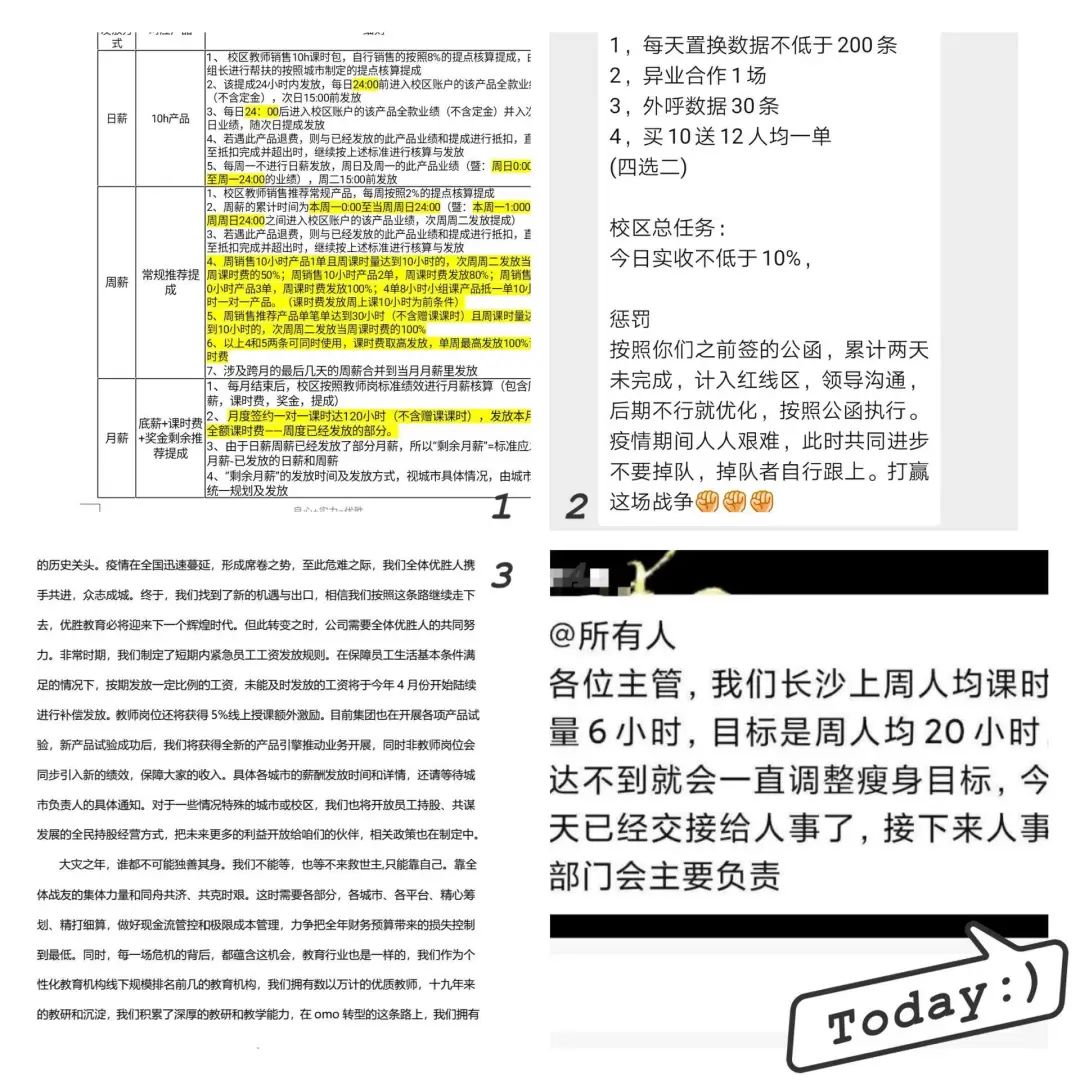 一周上20个小时的课,卖出120课时的课程,否则就强制离职或转兼职,如此激进的营销方式也引来了很多老师的不满。