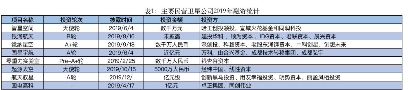 目前,中国商业航天仍处于基础设施搭建期,作为基础设施的一部分,卫星公司也受到资本关注。2019年,国内多家卫星创业公司均完成新一轮融资,如,国电高科宣布获得亿元级融资,国星宇航宣布获得近亿元A轮融资;银河航天2019年宣布完成B轮融资,虽未公布金额,但估值已达50亿人民币。2020年,国外也有卫星公司相继获得融资,如法国物联网卫星公司 Kinéis 2月宣布获得1亿欧元融资,美国商业通讯卫星初创公司 Astranis 同月宣布获得9000万美元的债权和股权融资。