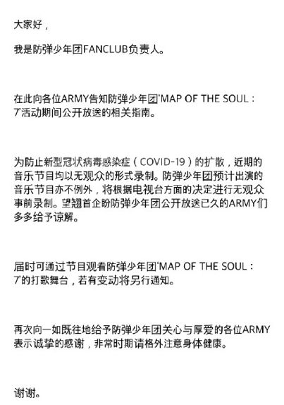 某种程度上,艺人巡演得以延期或中止是来自于对观众安全的考虑和粉丝造成的舆论压力。但同样需要大量工作人员聚集的偶像组合打歌节目等行程,截至目前并未被韩国方面明令叫停。根据防弹少年团FANCLUB官方说法,近期电视台方面均以无观众事前录制方式音乐节目。