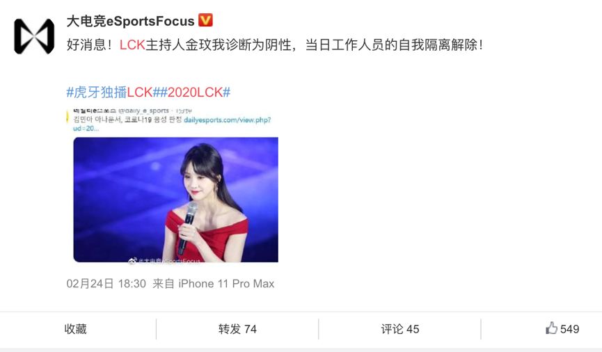 尚未就疫情对节目录制采取措施的韩国已经在2月23日经历了一场“惊吓”:英雄联盟韩国LCK职业联赛上,女主持人金玟我因体温过高被送往医院,在确诊前,所有工作人员和记者全员进行了自我隔离,一旦金玟我被确诊为新冠肺炎,将导致LCK中断。所幸次日传来消息,金玟我诊断为阴性,LCK得以正常进行。