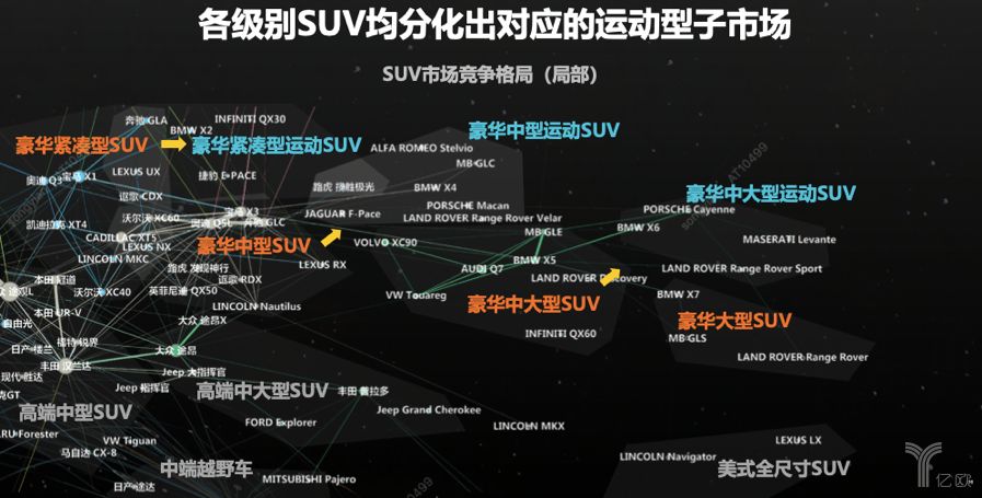 紧凑型SUV已经分成了5个族群;中国品牌大中型SUV族群在2016年还没有出现,而现在已 经形成稳定的市场。