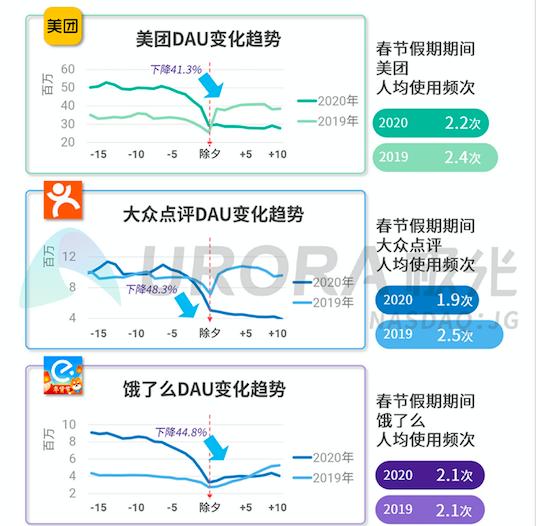 另一方面,与餐饮业关系密切的外卖平台亦受波及。据极光大数据统计,春节假期美团平台的日活用户数较春节前下降40%,与去年同期比则下降25%。大众点评的日活下滑则更为严峻,不足去年同期日活的40%。