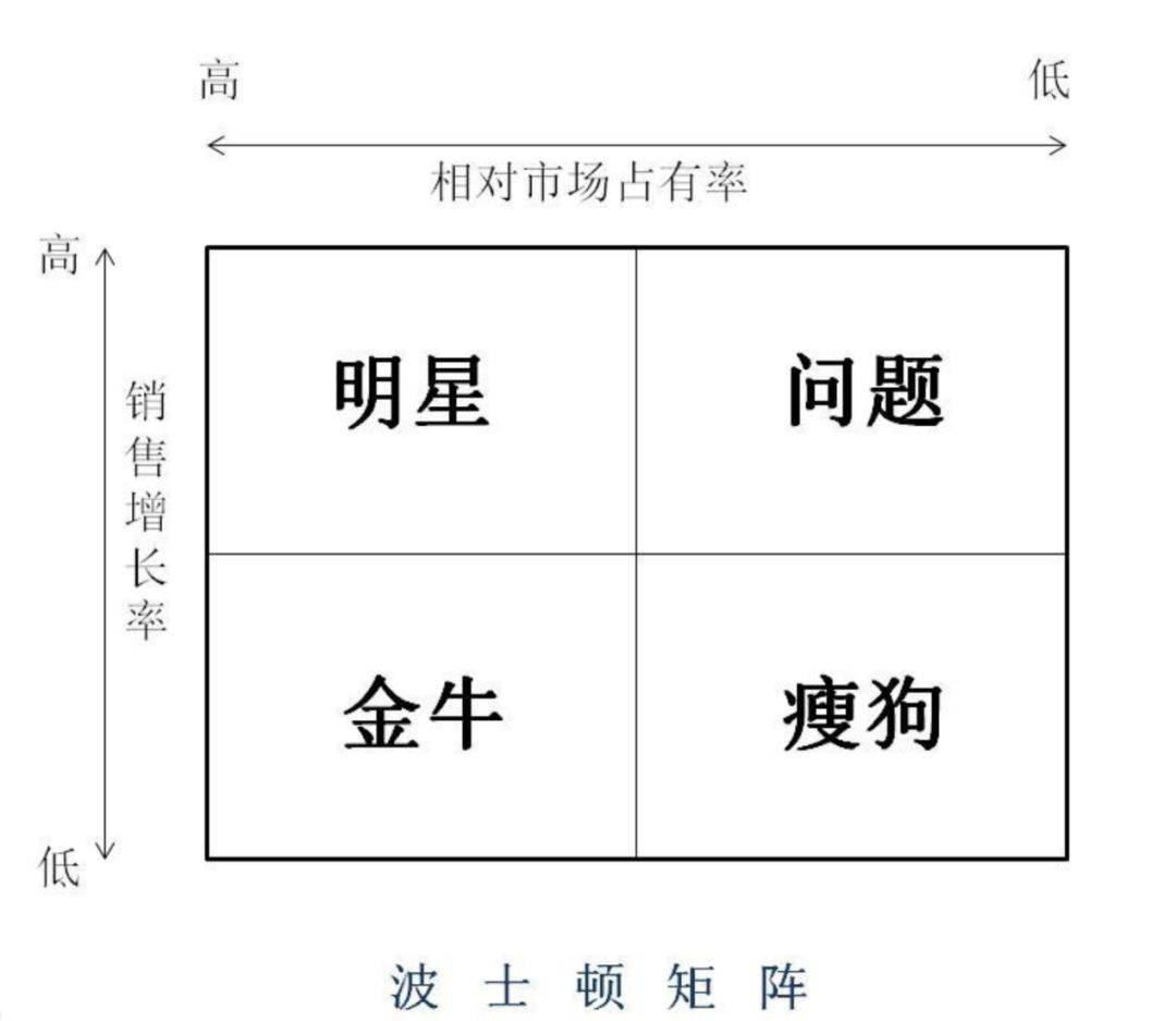 1970年,管理学中诞生了一个著名的波士顿矩阵,根据市场占有率和销售增长率的高低,将企业的业务划分为四种——明星类产品、金牛类产品、问题类产品和瘦狗类产品。