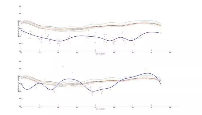 而下图中,蓝色曲线表示被怀疑使用兴奋剂的运动员表现:他们在职业生涯濒临结束时,运动成绩有了非典型、不正常地改善。